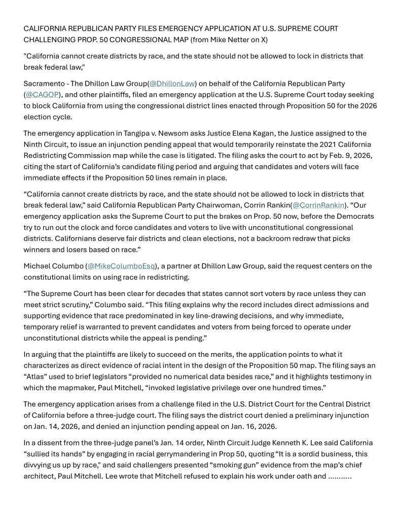 Prop 50 appeal at US Supreme Court Posted 2 days ago by Glenn Sheppard in Political Issues 3Views 0Likes Justice Kagan is reviewing officer for appeals from US Ninth Circuit Appeals Court – plaintiffs would like answer by February 9th (start of candidate filing period) Politics